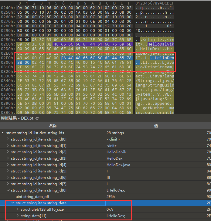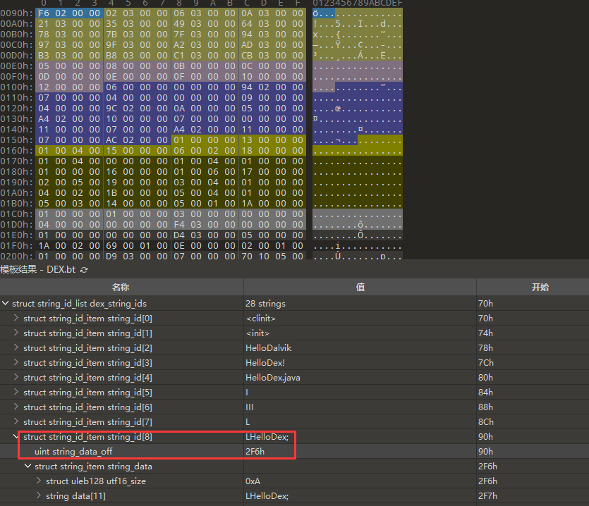 | utf16_size | uleb16 | 字符串的解码长度,使用UTF-16编码(?真是utf16,吗,看起来像是单byte,但是010的模板说是utf16) |