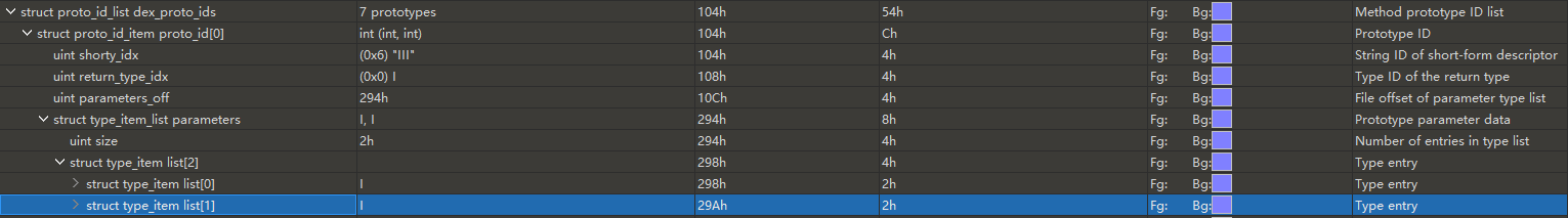 | shorty_idx | uint | 一个字符串id区的索引,这个索引对应的字符串id列表项中的偏移量存储的字符串是这个方法原型的短格式描述符。 |